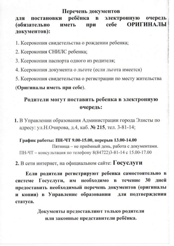1. В Управлении образования Администрации города Элисты по адресу: ул.Н.Очирова, д.4, каб. № 215, тел. 3-81-14;