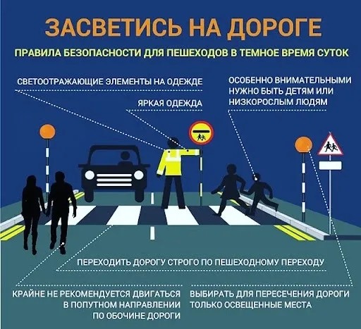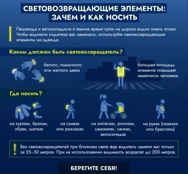 Согласно Правилам дорожного движения, пешеходы обязаны использовать световозвращающие элементы в тёмное время суток и в условиях недостаточной видимости при движении вне населённых пунктов по краю проезжей части или обочинам, а также на остановках и стоянках транспортных средств вне их.